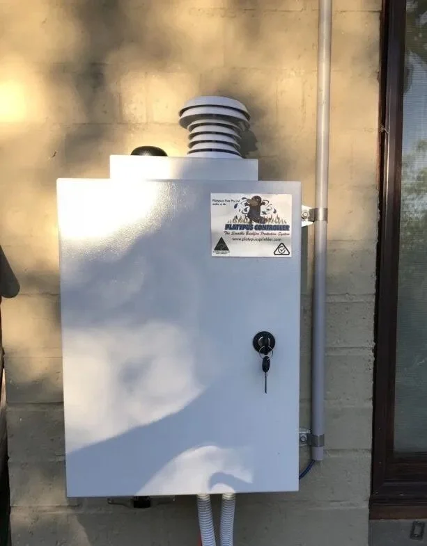The Platypus Wildfire Sprinkler System offers an affordable and simple to install water based fire protection system designed and made in Australia. The Platypus Wildfire Sprinkler System was inspired by the need for an affordable and simple to install sprinkler system that provides protection to homes, commercial and public assets from ember attack in the event of a wildfire. Sprinkler heads are typically mounted along the fascia line and or ridgeline of the building. Fascia line sprinklers are mounted to ensure water is sprayed onto the roof to keep gutters wet and create a curtain effect around the building. This means any embers are dampened and radiant heat reduced by water sprayed from sprinklers. The effect is similar to a fireman approaching a fire. The Platypus Sprinkler System can be installed by an approved installer.